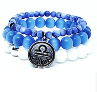 The perfect style gemstones for Libra's for the upcoming winter while wearing it in the fall. This stack contains one (8) mm pearl beads with one sterling silver bead & sterling silver flower bead cap cover. One (8)mm blue 'catseye' beaded stretch bracelet. And 1 (6) mm blue glass beads. All bracelets are stretchable and measure 7.5" for a average fit. If you need the size adjust please shoot us a email prior to ordering so we may make the proper fitting for your wrist.