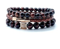 Men's set of red tiger's eye stretch bracelets with brown leather bracelet includes: