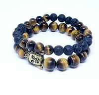 Sold as a set, these elegant spiritual bracelets represent courage and peace. 1 (10mm) tigers eye bracelet with 1 (14mm) gold finished Buddha bead head. The other is a mix of 8mm tigers eye bead with lava stone.